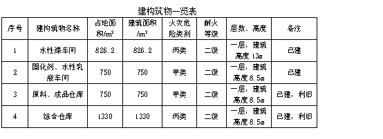 涉及的建構筑物有水性漆106)車間(利舊),固化劑、水性乳液104)車間(利舊),綜合倉庫,原料、成品倉庫。